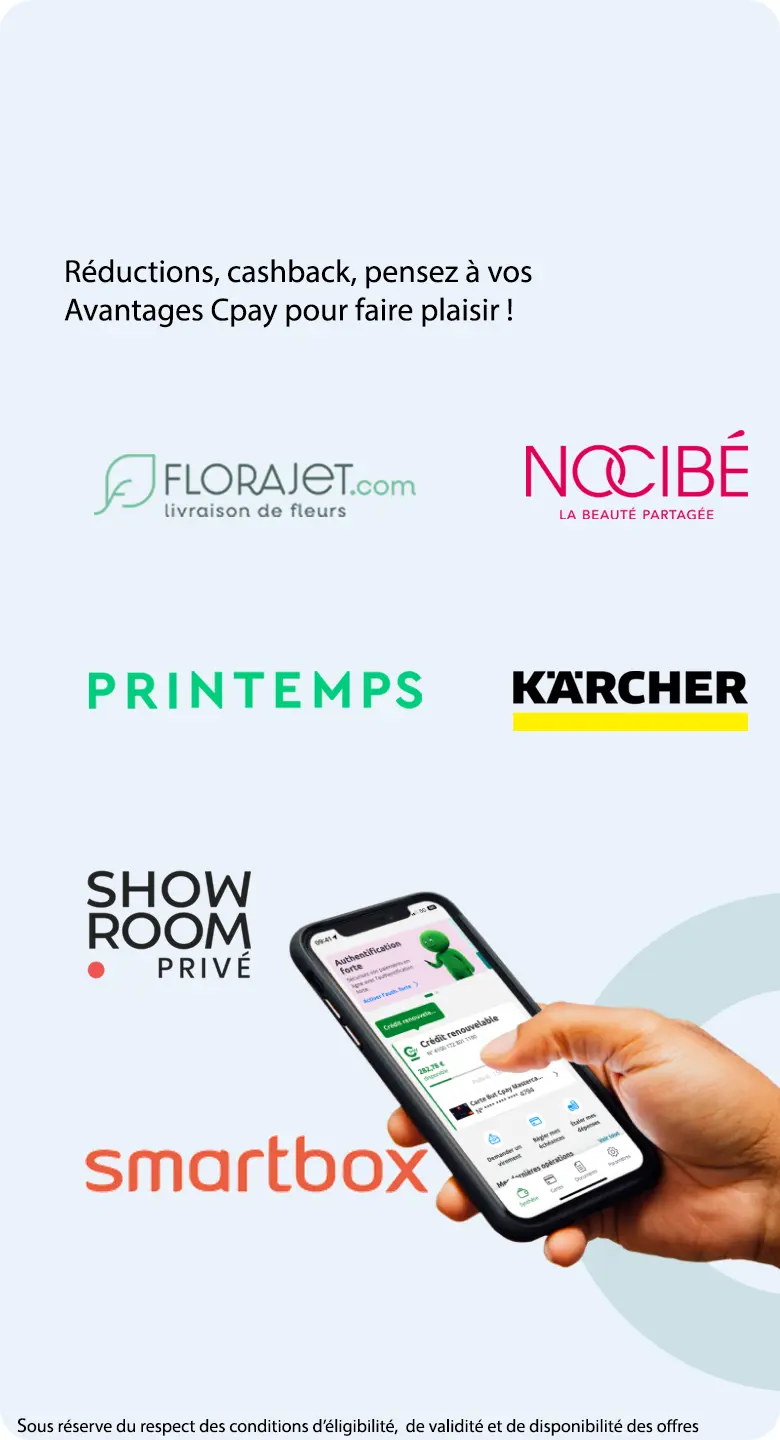 Le bénéfice des Avantages Cpay est conditionné à la validation de la Convention d’adhésion à l’Espace Personnel Cetelem qui est gratuite et facultative, sur le site Cetelem.fr ou l’Application Cetelem. Les offres de remboursement et les avantages immédiats sont soumis à des conditions fixées par les enseignes partenaires et indiqués dans l’Application Cetelem rubrique « Avantages ». Vous pourrez retrouver l'intégralité de vos offres du moment sous 48h à 72h. Offres non rétroactives et susceptibles d’être modifiées à tout moment. Pour bénéficier des offres de remboursement, vous devez régler vos achats avec votre carte de crédit Cpay Mastercard associée à un crédit renouvelable.